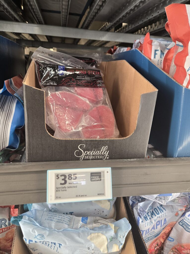 冷凍のシーフードコーナーに並んでいるマグロ。